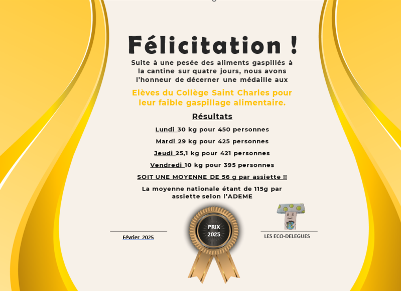 Les élèves de Saint Charles gaspillent peu. Nous pouvons encore nous décerner un diplôme cette année.