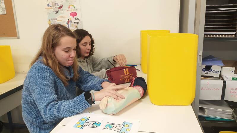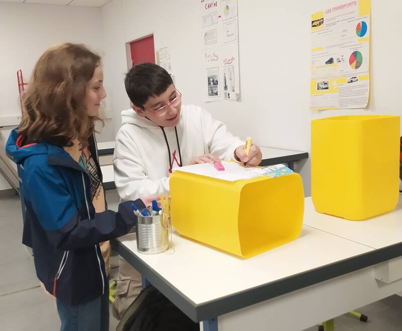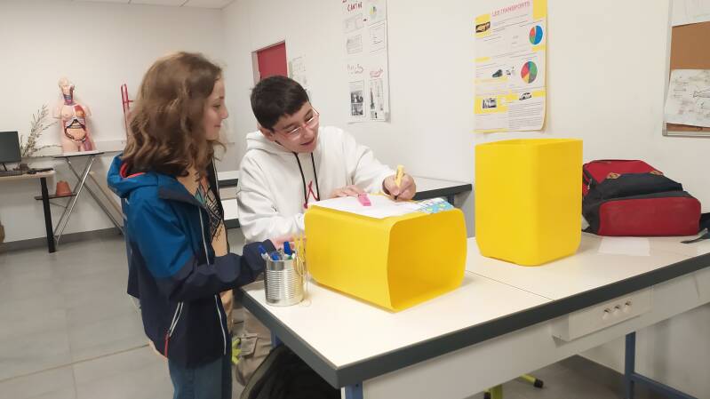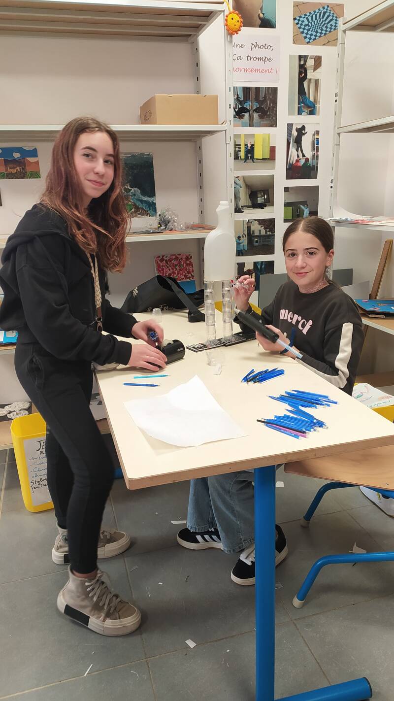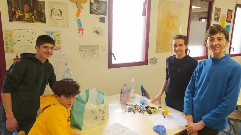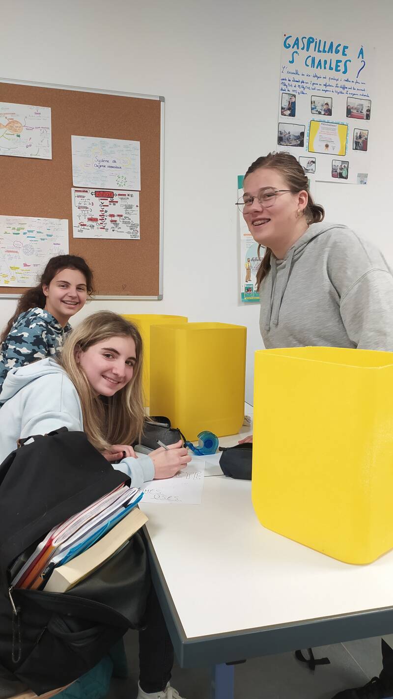 M. Matos a récupéré des contenants, Laurent les a nettoyés et les éco-délégués sont en train de les conditionner pour réaliser une collecte des objets plastiques jetés dans l’établissement : stylos, colles, scotchs, pochettes… Ces objets seront récoltés dans différentes classes de collège et de primaire. Dans un premier temps, les éco-délégués veulent estimer la quantité de ce plastique … ils ont déjà des idées pour la suite…