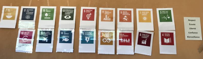 Les mots clés de la journée: respect, bienveillance, écoute nous permettent de plonger dans les ODD et commencer la formation sur la démarche de projet: plan d'action, bilan... La collation des confitures locales et du pain artisanal redonne de l'énergie.